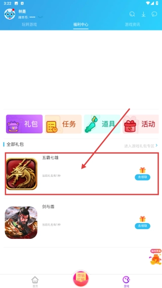 在福利中心里,找到五霸七雄游戏礼包的相关条目,点击该条目就能进入礼包详情页面。
