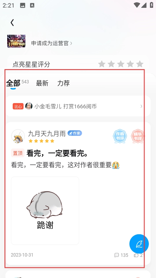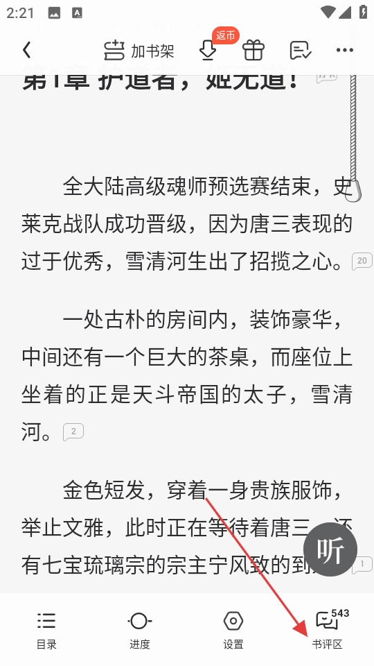 在主菜单页面,点击右下角的书评区,即可进入书评区页面。