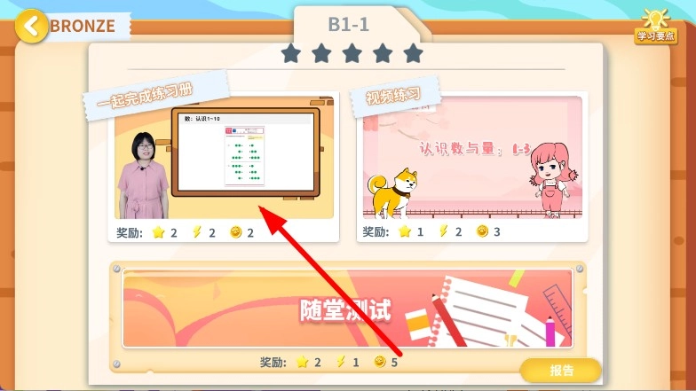 进入关卡内容页面后,选择“一起完成练习册”等学习模块并点击。