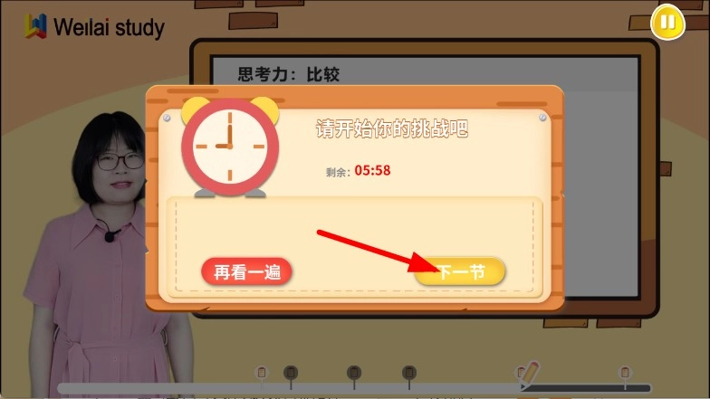 视频学习结束后,会弹出提示框,点击其中的下一节按钮,就能继续进行后续的学习内容。