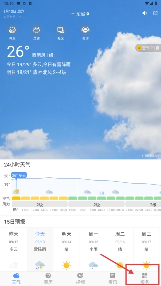 打开天气应用,待页面显示东城区天气时,点击底部的服务选项,即可进入服务页面。