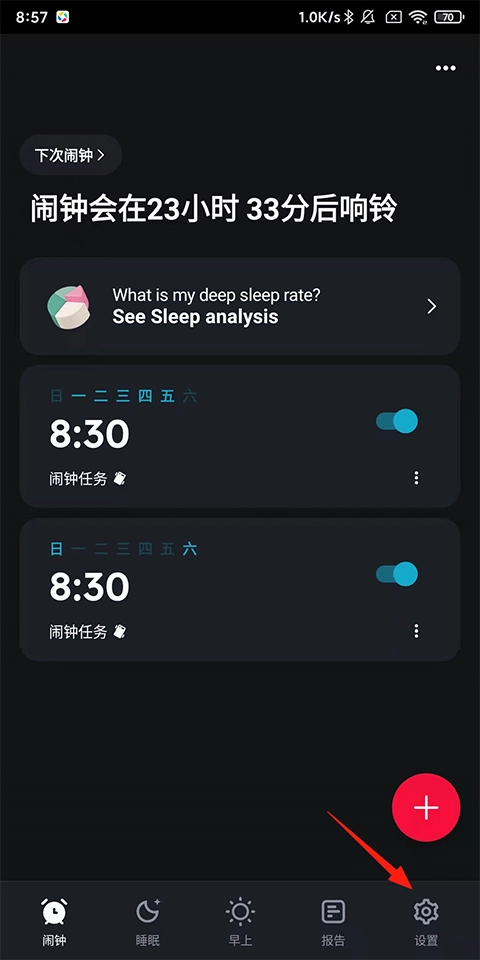 1、打开睡你妹闹钟,点击【设置】;