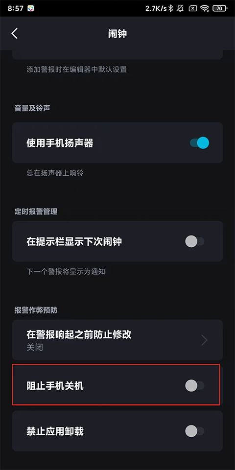 3、找到并开启【阻止手机关机】右侧的开关即可。