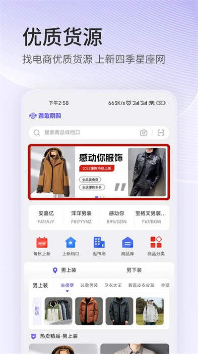 跨联易购是一款非常实用的手机购物应用,专注于满足用户的购物需求。它提供了丰富多样的商品分类,让用户能随时选购心仪的商品。平台涵盖了多个品牌的高品质男装,均为当季热销款式,全面契合用户的购买需求,用户可以通过这款软件便捷地下单购物。