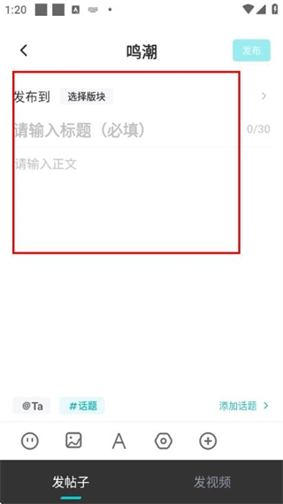 在首页点击底部的加号按钮,进入帖子发布页面。