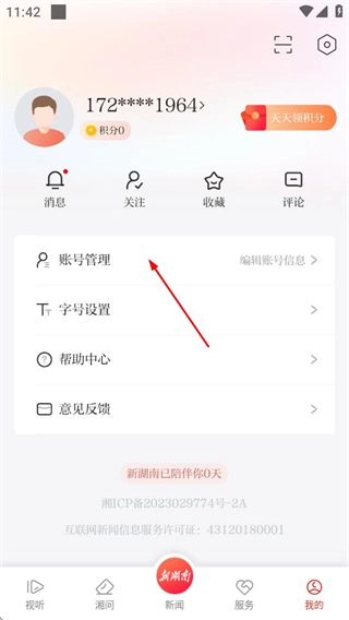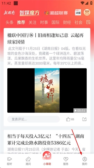 在新湖南的新闻页面,点击底部的“我的”选项,就能进入个人中心页面。