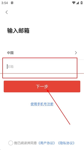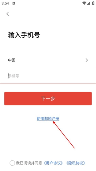 在填写手机号的页面,点击“使用邮箱注册”选项,即可切换到注册界面。