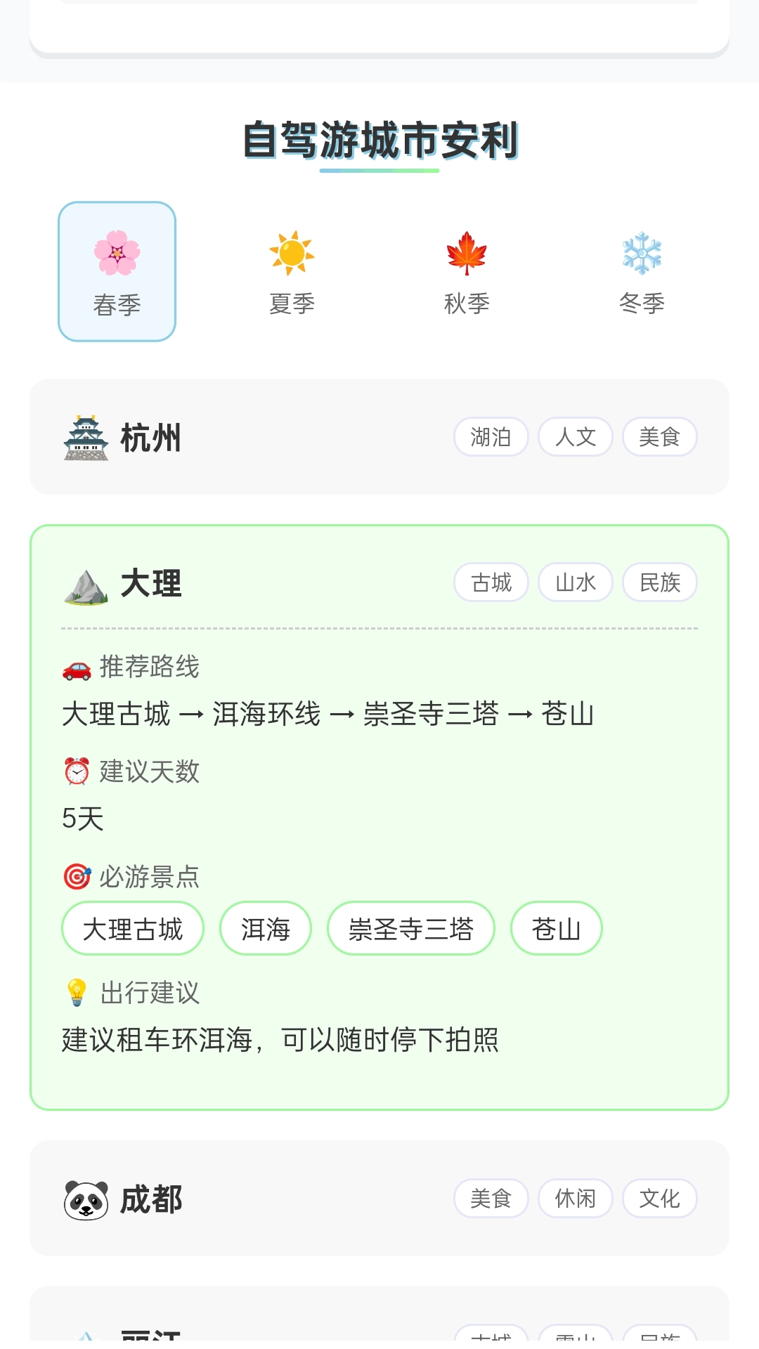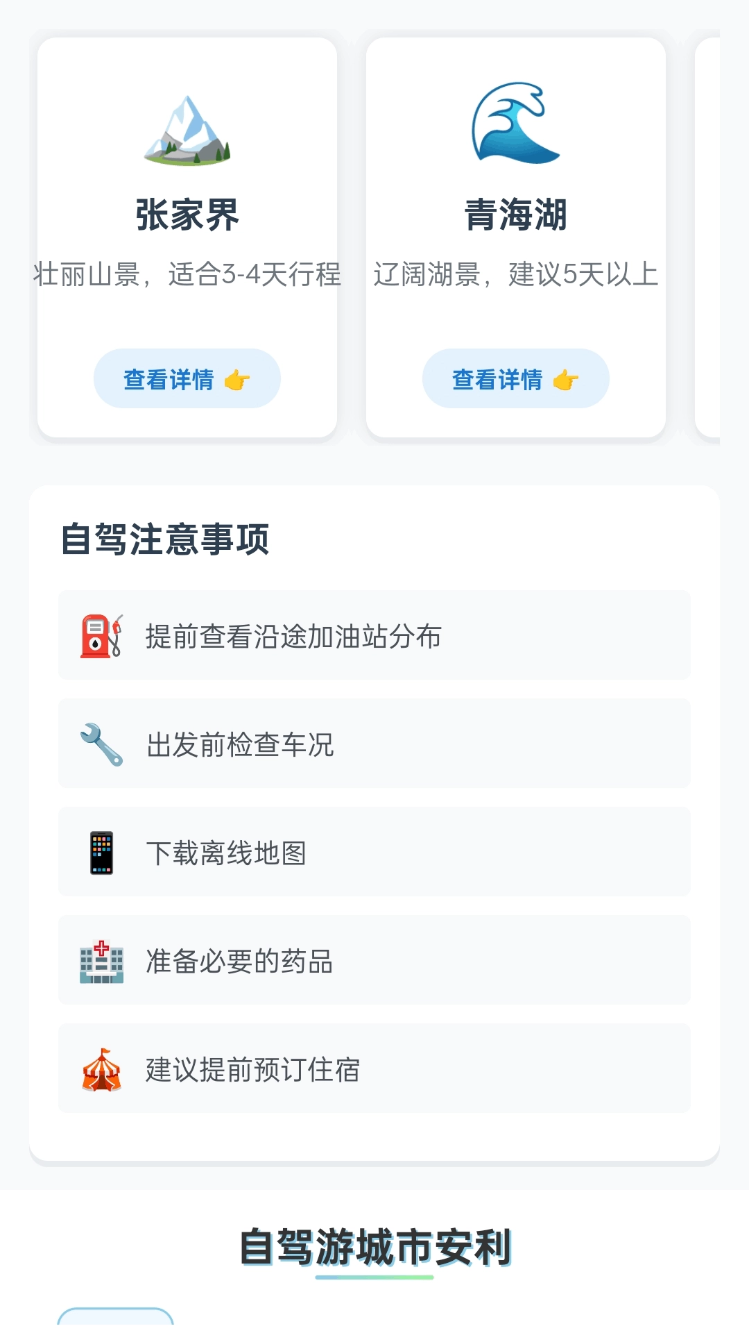 自驾游服务包含“精选自驾游目的地”推荐,同时附上行程规划建议,另外还提供自驾注意事项,助力保障出行安全。