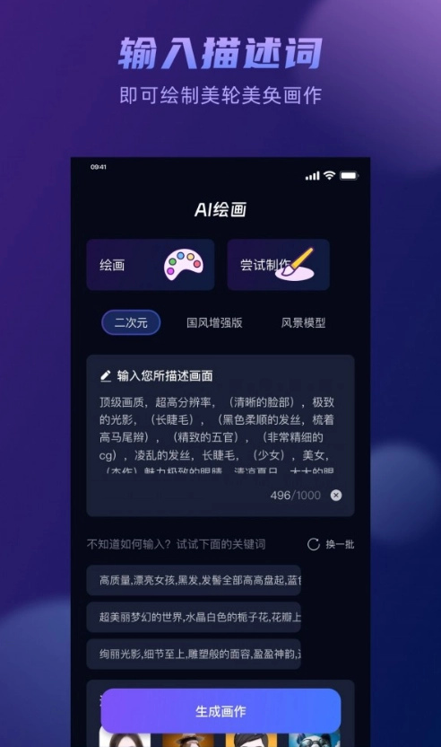 借助人工智能技术,可依据用户输入的简洁描述或图片,自动生成满足用户需求的绘画作品。