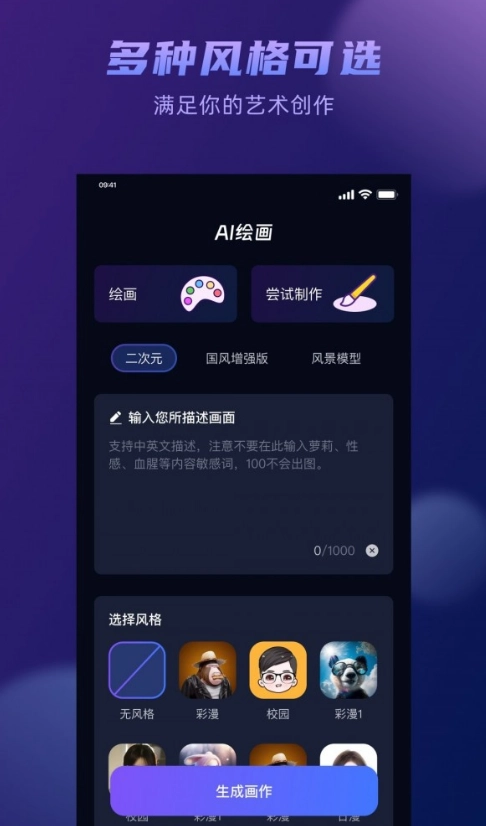 提供了卡通、写实、素描等多种绘画风格,能够满足不同用户的喜好与需求
