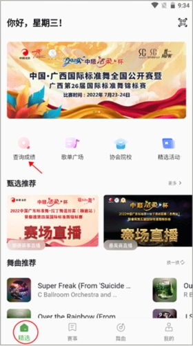 针对舞蹈赛事设计的专属计分模块,助力主办方高效完成评分、成绩汇总与发布,简化传统人工计分的繁琐流程。1、打开软件进入主界面后,点击左上角的“查询成绩”选项。