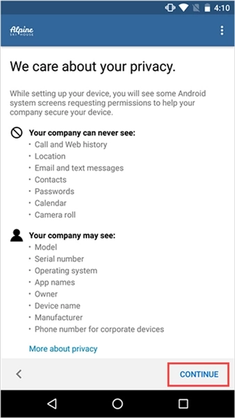 允许公司门户访问你的联系人:此权限允许公司门户应用创建、使用和管理工作帐户。允许此权限是安全的。Microsoft永远不会访问你的联系人。如果拒绝权限,下次登录公司门户时,系统会再次提示你。若要关闭这些消息,请选择“不再询问”。若要管理应用权限,请转到设置应用>应用>公司门户>授权>手机。