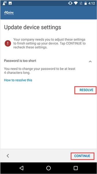 8、组织或许会要求你更新设备设置。点击“解决”来调整相关设置,等设置更新完成后,再点击“继续”。