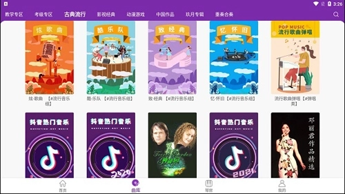 2、曲库内设有教学专区,此外还包含考级专区、古典专区、影视经典、动漫游戏、中国作品、玖月专辑以及重奏合奏等板块。