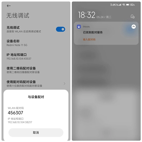 2.进入Shizuku操作流程为无线调试启动中【配对】-【开发者设置】-【无线调试】-【开启无线调试】-通过配对码配对设备