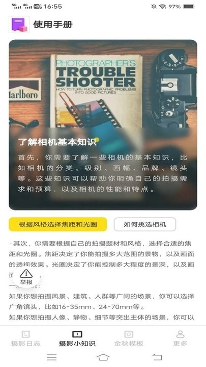 金秋相机是一款融合摄影日志、摄影小知识与金秋模板的应用。