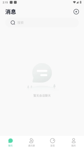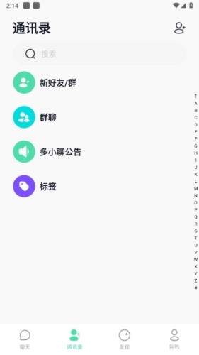 1、启动软件后,进入“通讯录”页面,在该页面点击右上角的“+”按钮。