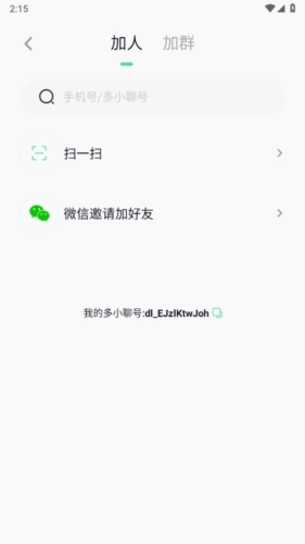2、接着在“加人”界面,我们可以输入对方的手机号或多小聊号,也可以通过扫一扫或者微信邀请的方式来添加好友。