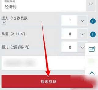 3、进入航班页面,按照页面提示操作,点击搜索航班完成购买;