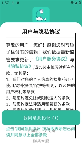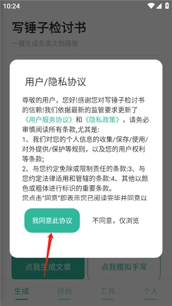 1、打开锤子检讨书的撰写界面时会直接弹出用户协议书,只需等待几秒钟,待按钮颜色变化后点击“我同意此协议”即可。