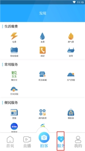 4、点击“服务”选项。该板块为用户提供生活缴费、常用服务、便民服务等多种功能。