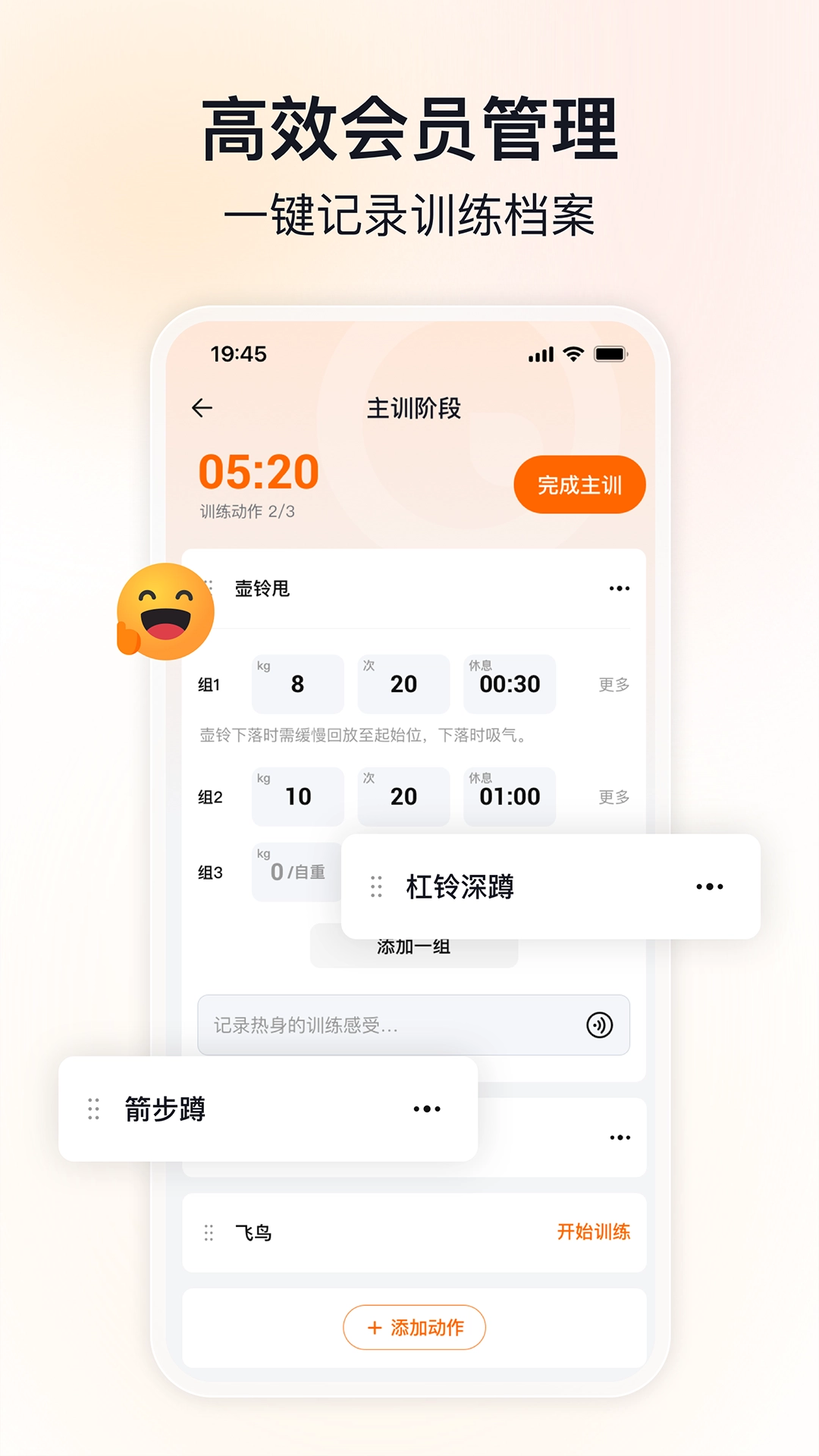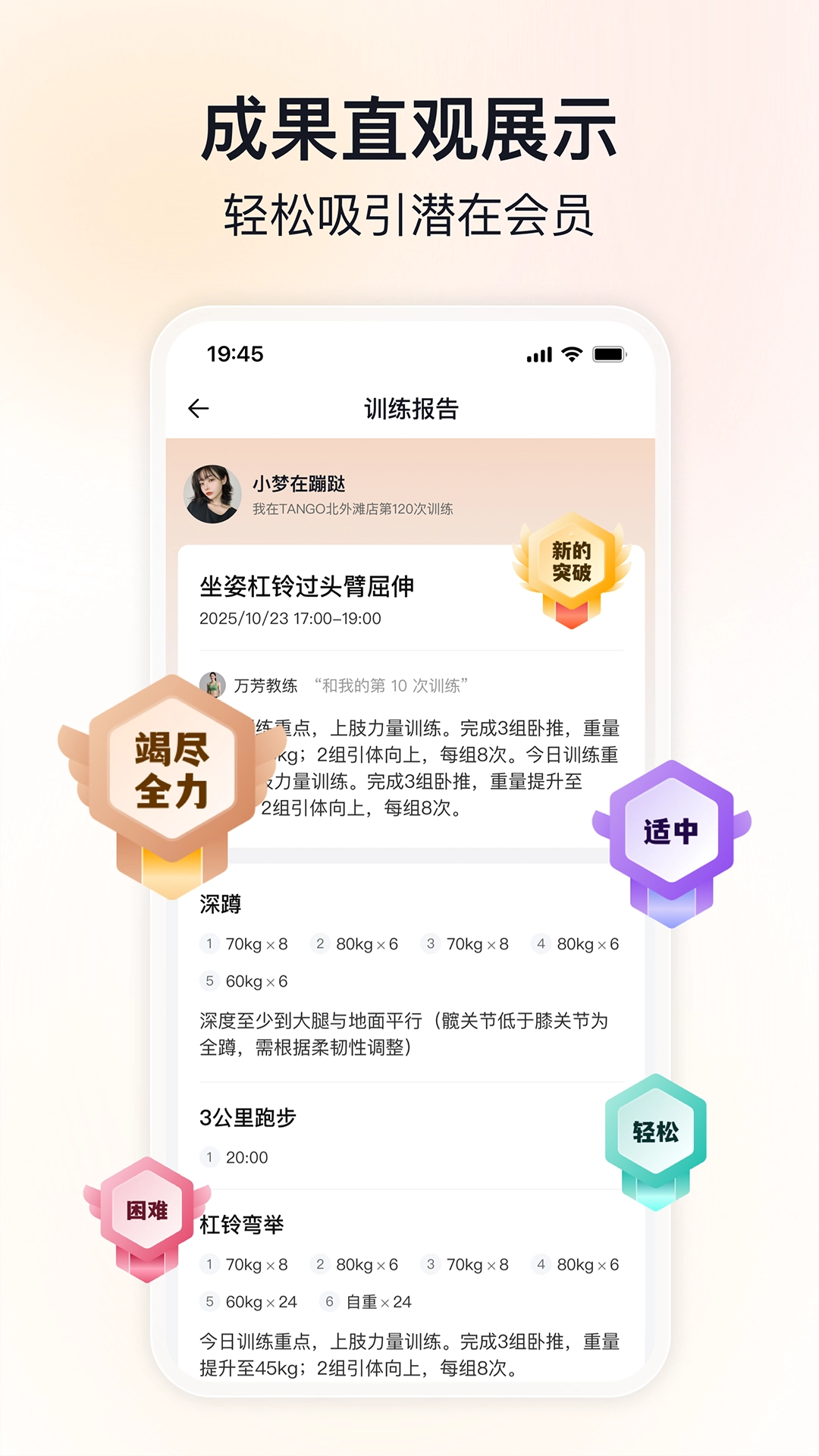 2. 智能训练档案:可便捷记录每次训练的各类数据,包括动作类型、组次数量、使用重量以及训练体感等信息;系统会自动将这些数据整合为会员专属的可视化成长档案,并通过云端进行安全存储。
