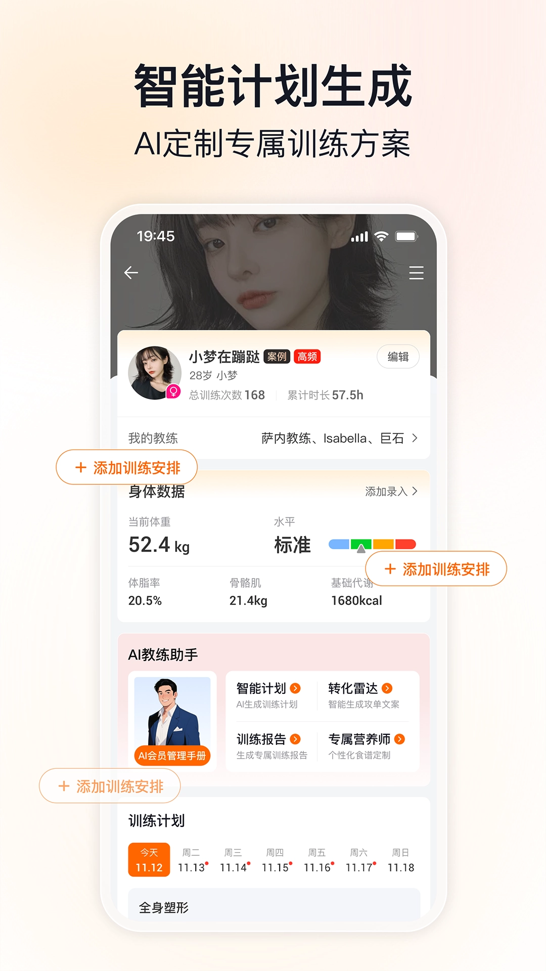1. AI效率引擎:聚合海量健身垂直领域智能体,可覆盖潜在会员升级转化、付费会员日常维护、停训会员激活召回、推广文案智能创作等健身教练高频工作场景。