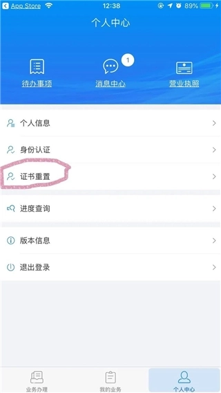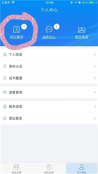 3、设置好证书密码后返回个人中心界面,点击左上角的待办事项;