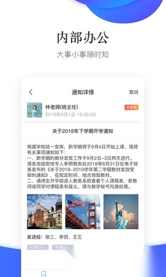 掌通校园学校免费版是一款服务于学校管理者与教师的移动管理平台。该平台具备校园考勤管理、家校通知传达及内部办公协同等功能,能够帮助学校更高效地统筹和发布各类任务,从而提升整体的管理效能。