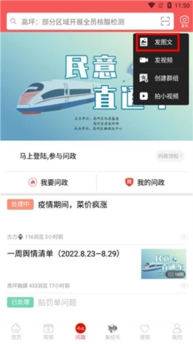 2、进入问政窗口后,点击右上角的【发布】按钮,接着在弹出的选项中选择【发图文】