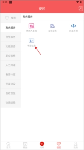 1、从首页切换至便民界面,点击政务服务板块中的“学籍信息”选项。