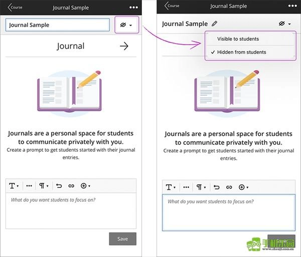 在新杂志页面中,找到杂志标题旁的眼睛图标并点击,随后选择是隐藏Blackboard还是让学生可见。