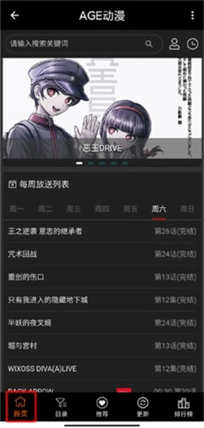 1、首页页面:每周会进行内容放送,在这里可以查看每天的动漫更新情况;
