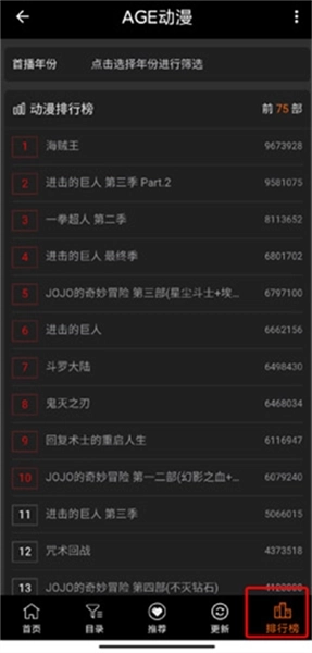 5、排行榜页面:会对每一年的前75部动漫进行排序展示。