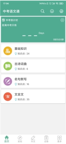 1、进入语文中考通电子版,大家既可以设置中考倒计时,也能查看各类语文相关知识点。