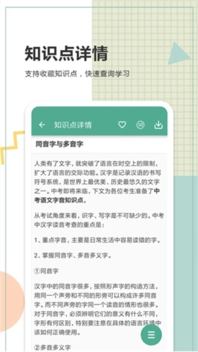 2、知识点:涵盖中考语文科目的全部中考知识点详解,具体包含基础知识、古诗词曲、名句默写、文言文与现代文阅读、写作等主要模块。