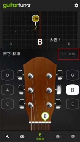 1、打开软件,默认是自动吉他调音,拨动琴弦软件会显示对应的弦和音准,不断调整使标尺位于中间并全绿通过就表示调准了