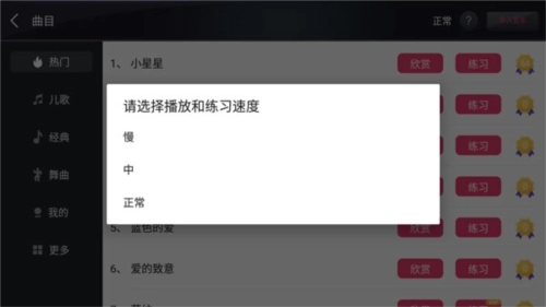 3、点击右上角的“选择音乐”选项,我们就能挑选不同类型的钢琴曲进行练习。