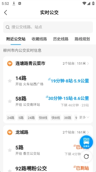 2、可随时查看所选站点即将到站的公交车的实时位置、实时到站信息及距离等动态数据。