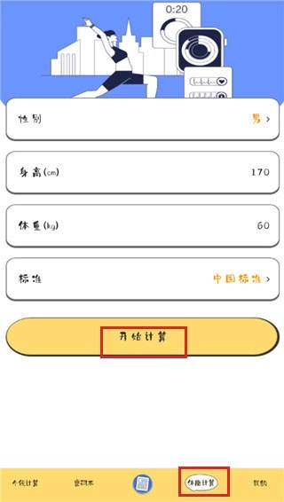 1、点击底部导航栏的体脂计算功能,依次输入性别、身高、体重等相关信息,然后点击开始计算按钮。