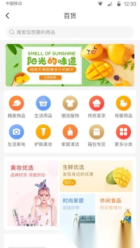 覆盖粮油、副食、生鲜、家居、酒水等全品类商品。