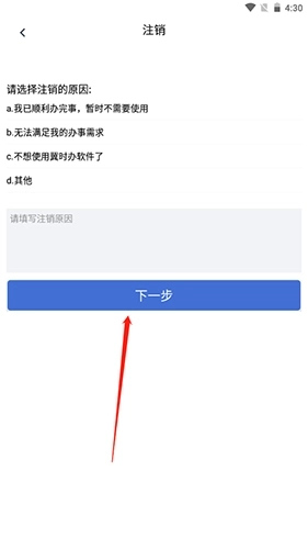5.选择注销原因后点击下一步按钮