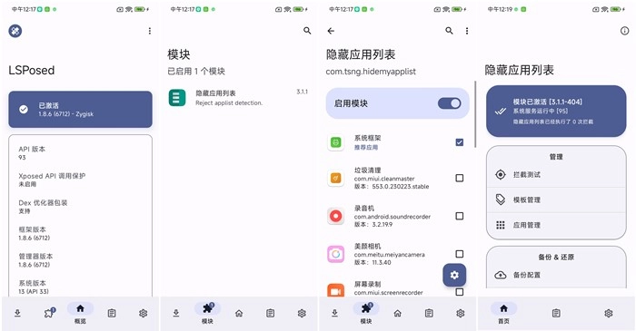 1、类似XPosed时代的模块一样,HMA软件也是一个模块APK,可基于zygisk环境或者riru环境生存,这里推荐大家zygisk版本。想要使用HMA模块,必须先激活LSPosed模块。先通过这个教程:LSPosed框架正确激活你的LSPosed框架,再安装HMA进入LSPosed框架,点击模块,找到隐藏列表功能,滑动按钮启动,并且打钩系统框架按钮,重启手机。
