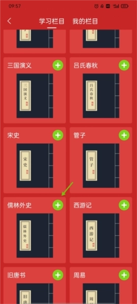 2、上方是已经添加好学习栏目,往下翻,会有很多的书籍可以添加,点击自己喜欢的栏目右上角的“+”。