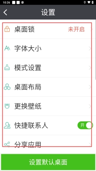 2、在设置界面,涵盖了桌面锁、字体大小、模式设置、桌面布局等功能。