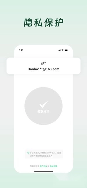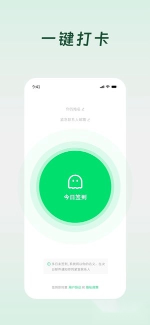 无需注册登录,首次使用只需填写联系人姓名与邮箱即可完成设置;每天打开应用轻点一下就能完成签到,系统会在后台自动监测状态,不会影响日常习惯,整体操作简单易上手。