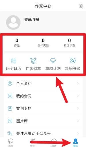 4、点击“我的”页面后,你可以查看个人作品、创作天数、累计字数等信息,还能参与激励计划和经验等级体系。