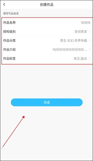 3、接着填写作品名称、类别、简介、标签等信息,之后点击完成按钮