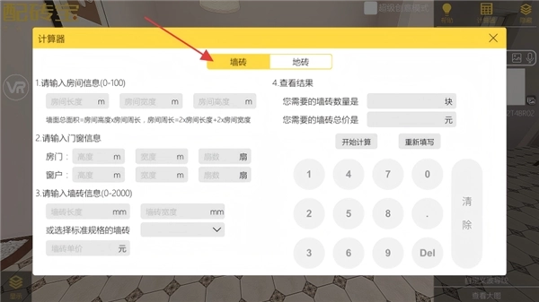 4、在计算器里点击【墙砖】标签,就能输入相关信息来计算墙砖的数量与总价。