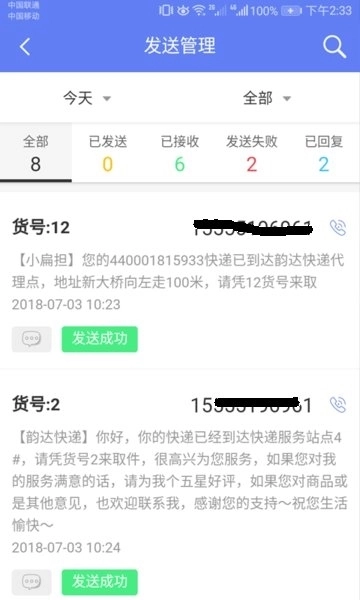 4.用户反馈:能够查询客户回复的短信,以便及时掌握异常件的动态信息。